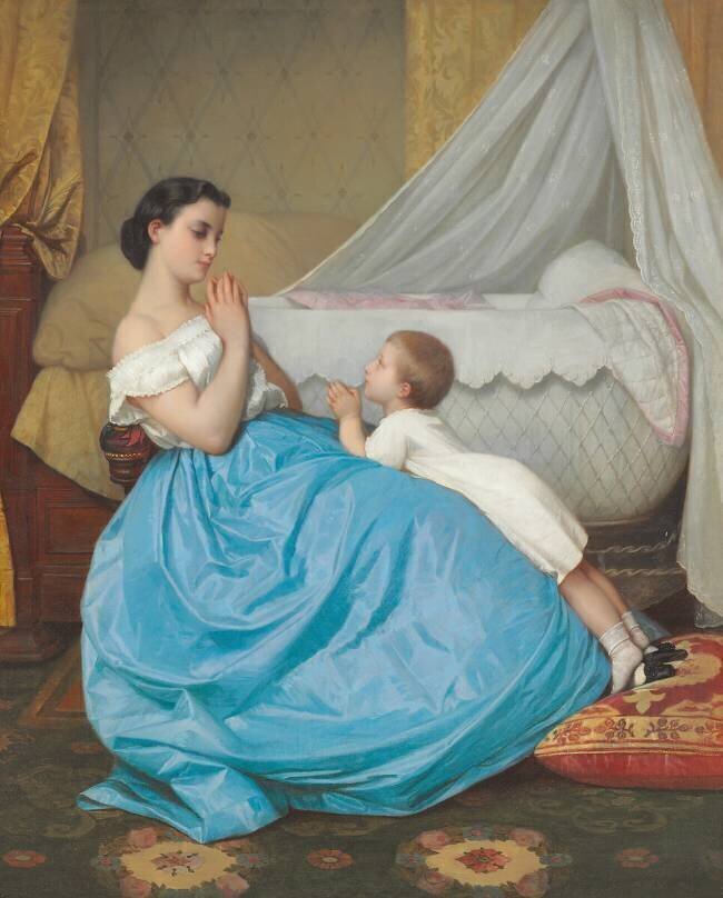 Keywords : 19th century, Painting, bed, bedroom, blouse, blue, boy, brunette, brunette, canopy, child, childhood, clothing, clothing, colour, cradle, cushion, dress, family, full-length, furniture, furniture, hair, hair, hair, human, inside, lesson, maternity, mother, oil, oil, Painting, people, people, pillow, portrait, portrait, prayer, religion, room, skirt, son, teaching, white, woman, young woman, youth