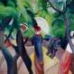 In the Autumn of 1913, Macke, together with his wife and son, moved to Switzerland, settling in Hilterfingen, on Lake Thun, where he would spend eight months, from September 1913 to May 1914, working intensively. The Promenade painting is the first created during this period, and the first where Macke used the motif of a walk in a park near a bridge and water. Decisive for Macke was the influence of the contemporary French painting, above all the work of Robert Delaunay. For Macke, this event was a turning point in understanding the role of light and color in painting. According to his wife, Elisabeth Erdmann-Macke, in the his final paintings there can be noticed the airiness of colors, wonderful luminosity, especially in the green tones of trees, transparency of heavenly blue, sunspots on the ground, where shades change from shining yellow to deep red-brown. He painted figures of people without sharp contrasts, and without outlining them with a clearly defined contour.