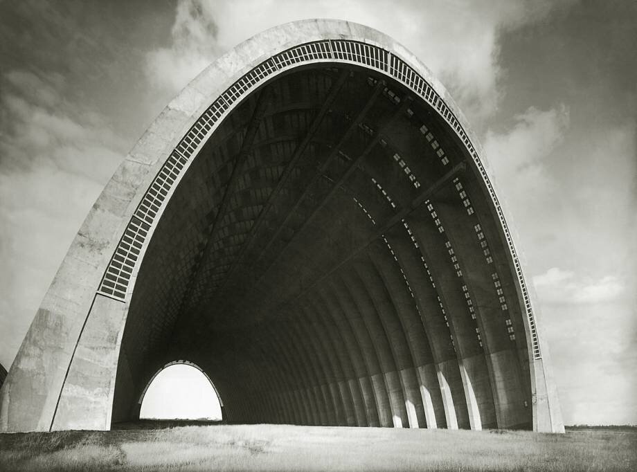 XIR196914 Aircraft hangars used by the Societe des Entreprises Limousin, 1921-23, photographed in 1932 (b/w photo) by Freyssinet, Eugene (1879-1962); Orly, Val-de-Marne, France; (add.info.: Freyssinet is considered as the father of pre-stressed concrete; made of shell reinforced concrete;); French, in copyright...PLEASE NOTE: This image is protected by the artist\'s copyright which needs to be cleared by you. If you require assistance in clearing permission we will be pleased to help you.
