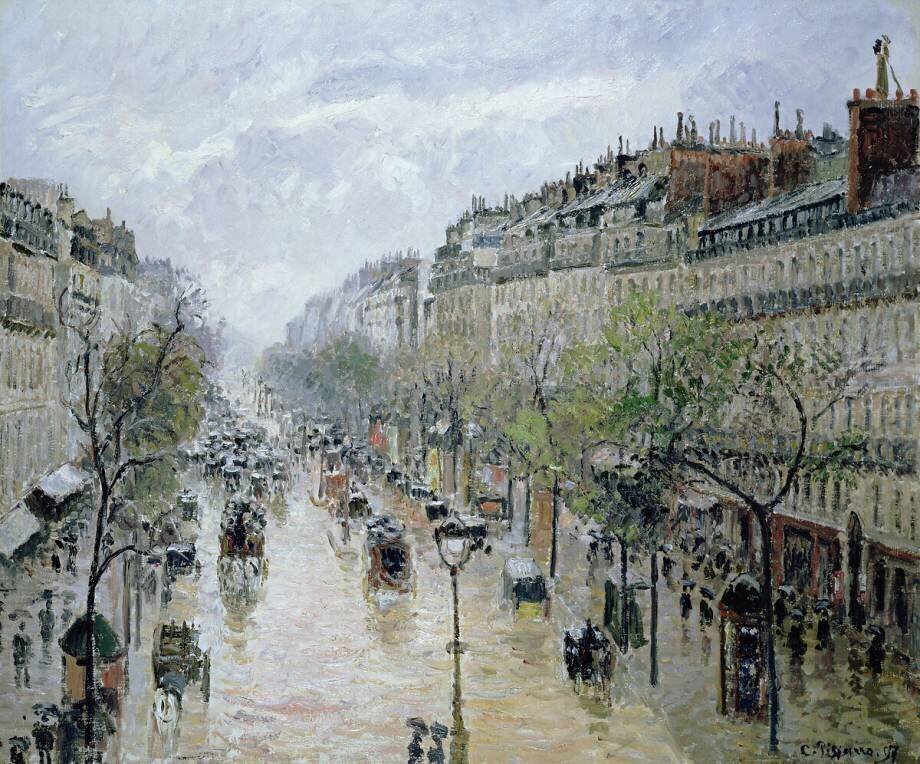 Pissarro would continue to experiment throughout his long painting life, constantly seeking discoveries, change and innovation. In the late nineteenth century, he believed that creating serial works provided him with the artistic freedom he sought. His heart lay in exploring changing light and weather effects, at different times of the day and different times of the year: an Impressionist principle par excellence. The fourteen canvases he made in 1897 of Boulevard Montmartre, one of Paris' largest boulevards, are a prime testimony to this. He painted this series from his hotel room in the Grand Hôtel de Russie, high above rue Drouot. Pissarro worked on his series from February to March. Later, in 1898, he would make another similar series of works of the Place du Théatre Français. In 1901-1902, he concluded his career with a series of works of the Pont Neuf.