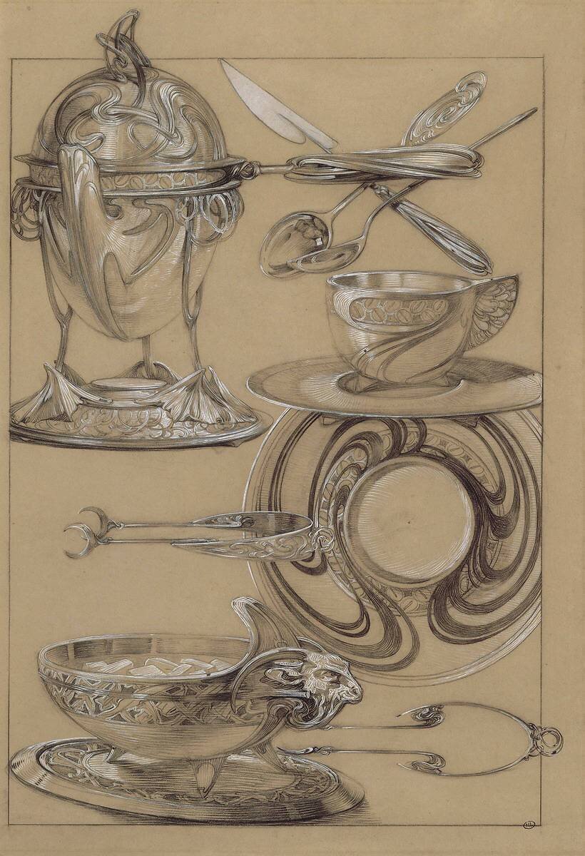 Subjects: Preparatory drawing & sketchKeywords: 19th century, Art Nouveau, Paris 1900, cover, crockery, cup, decorative arts, hot chocolate pot, lunch, lunch service, sugar bowl(Ref : 16025) © RMN /Gérard Blot