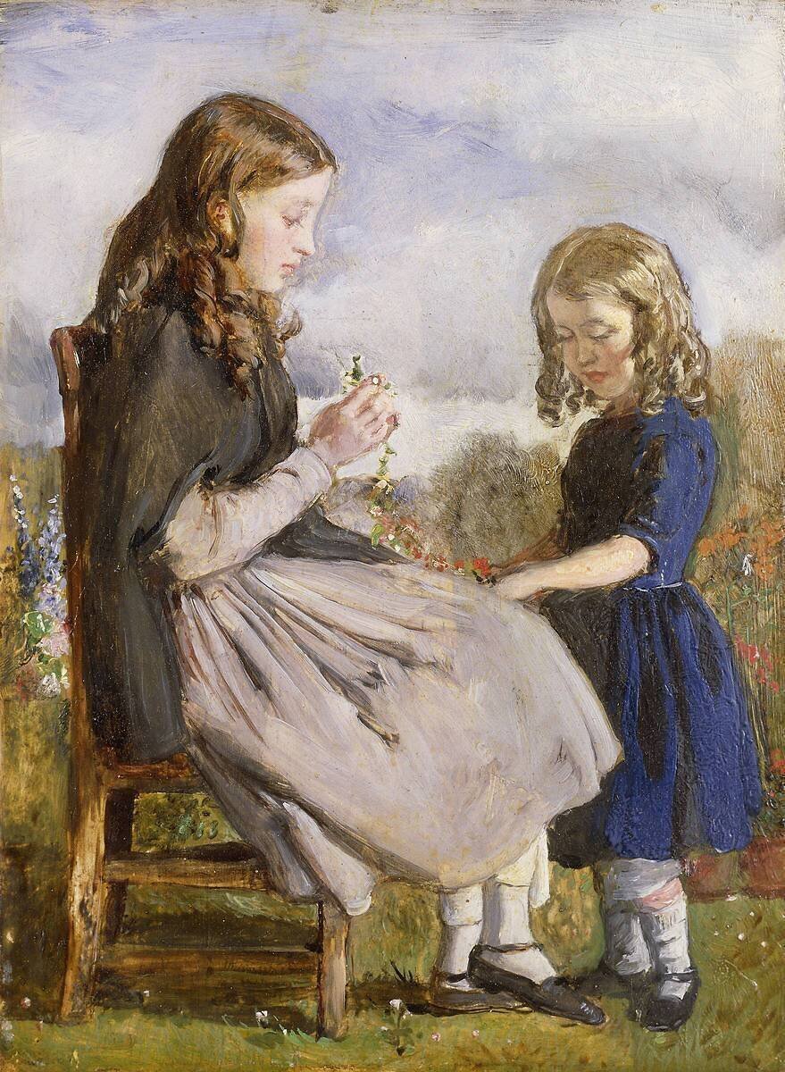 Keywords : 19th century, Painting, Pre-Raphaelite, blond, blue, brunette, chair, child, childhood, clothing, colour, concentration, country, craft, day, dress, fair, family, friend, friendship, full-length, furniture, girl, grass, hair, help, human, kid, nature, oil, outside, people, plant, quiet, season, seat, shawl, silence, sister, sitting, standing, summer, weaving, youth