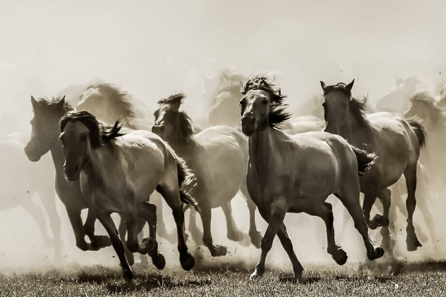 Subjects: AnimalsKeywords: blurred foreground, grey, herd, horse, movement, photography, race, speed, white(Ref : 193375) © Heidi Bartsch / 1X