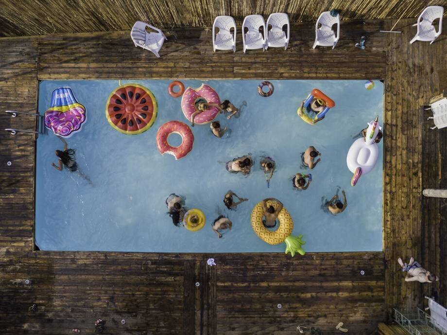 Keywords : aerial view, bright colours, chair, contemporary visual photography, friend, friendship, group, high-angle, ladder, parquet, person, photography, relaxation, screen, swimming pool, water