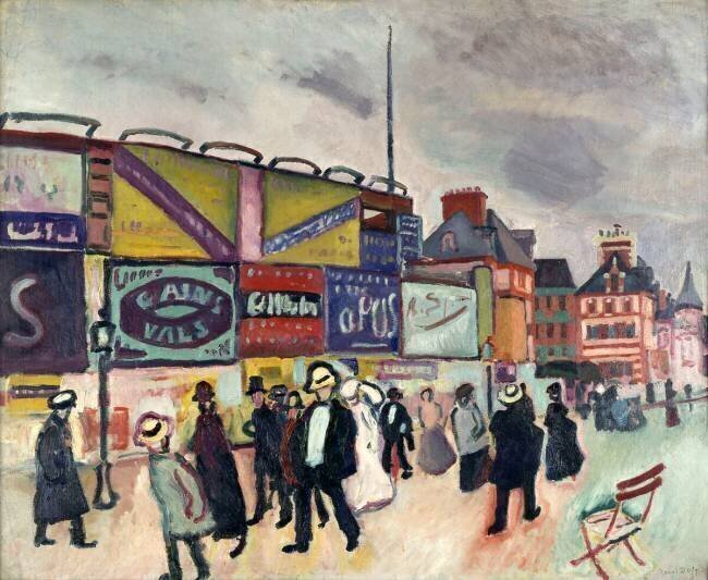 Dans une perspective animée, des bourgeois parcourent une promenade en front de mer, l’un d’eux serait d’ailleurs le dramaturge Henri Bernstein. C’est un spectacle banal et quotidien, mais les rues grises et mornes sont cependant surplombées d’affiches tapageuses. On comprend aisément pourquoi Raoul Dufy s’y intéressa: leurs tonalités vives ont tout simplement retenu le regard de ce grand coloriste. Dufy n’a pas hésité à utiliser une palette affirmée et vive, ainsi son ralliement au mouvement fauviste ainsi que sa future voie décorative.