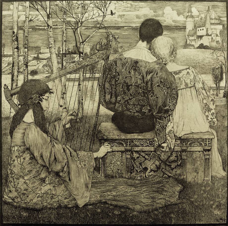 Subjects: Feminine Beauty, LandscapeKeywords: 19th century, Pre-Raphaelite, couple, from behind, harp, landscape(Ref : 366035) © akg-images