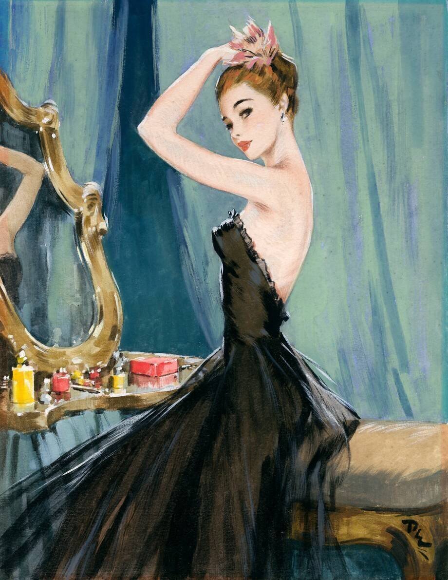 Depicting a slender woman in a strapless black evening dress at her dressing table fixing a flower into her swept up hair