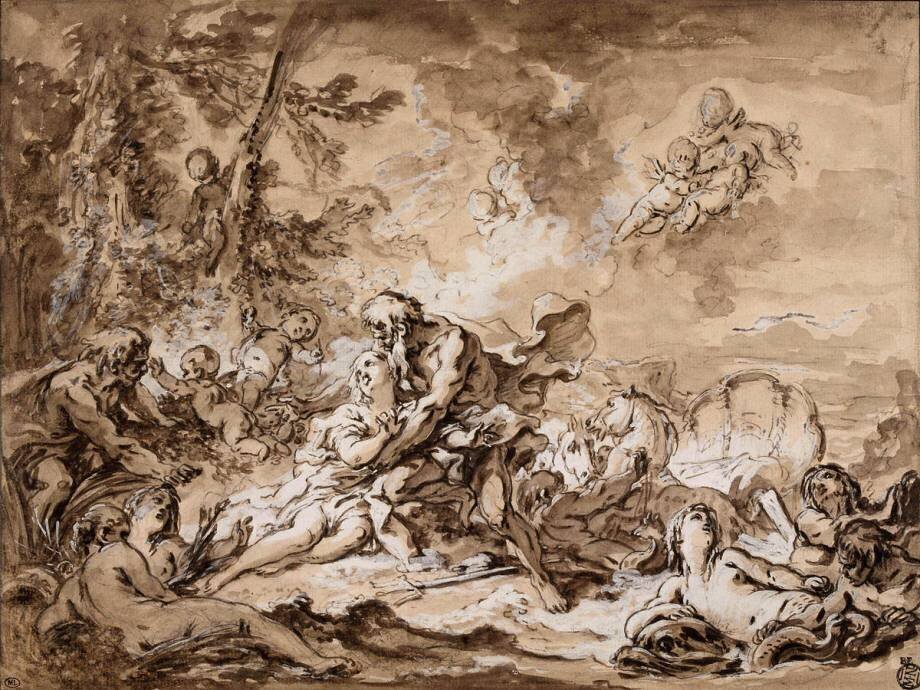 Subjects: FantasyKeywords: 18th century, Neptune, Rococo, cloud, drawing, man, putto, snake, tree, woman(Ref : 120553) © RMN (Musée du Louvre) /Thierry Le Mage
