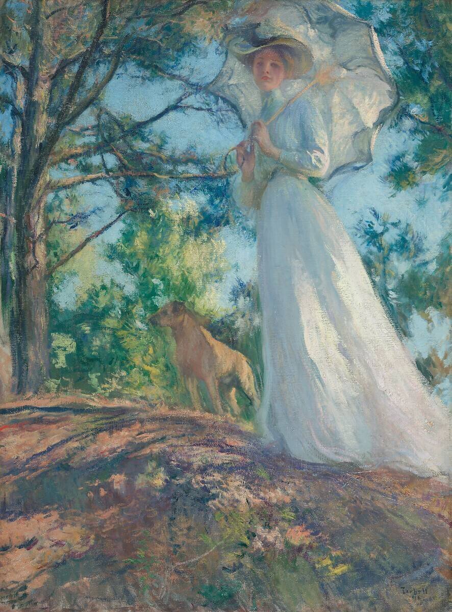 Keywords : Impressionism, Painting, dog, forest, hat, hill, Painting, parasol, summer, tree, woman