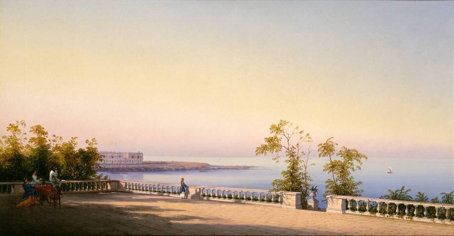 Keywords : 19th century, balustrade, coast, cup, evening, landscape, man, morning, nature, Painting, picture, quiet, sea, sight, silence, tea, terrace, twilight, woman
