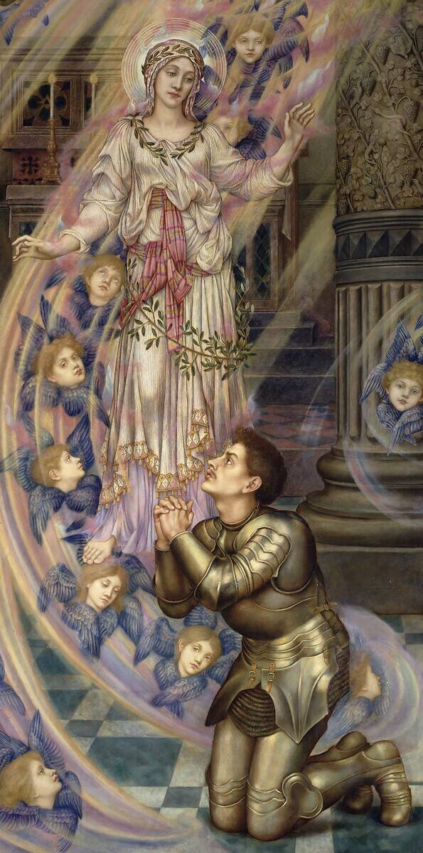 Subjects: MythologyKeywords: Pre-Raphaelite, altar, angel, halo, kneeling, knight, knight, prayer(Ref : 330016) © De Morgan Foundation / Bridgeman Images