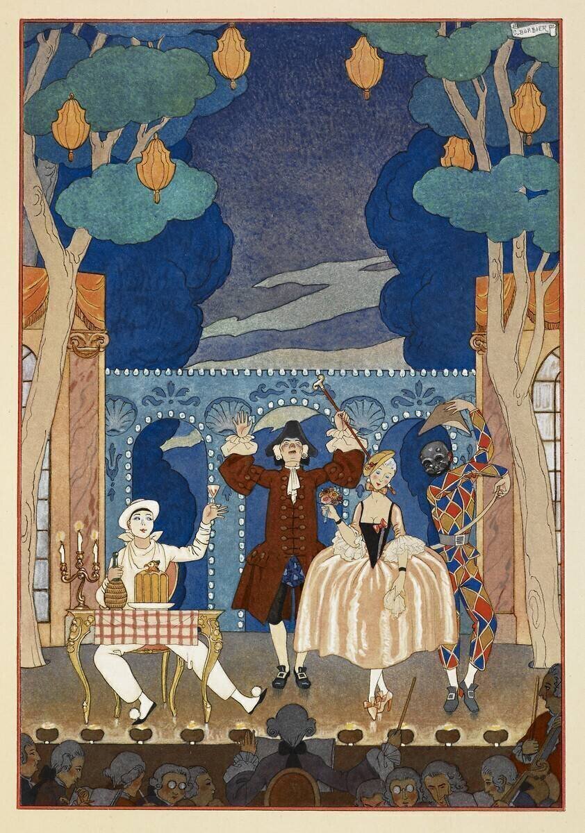 Keywords : 18th century, 20th century, Art Deco, Harlequin, Pierrot, pantomime, scene, theatre