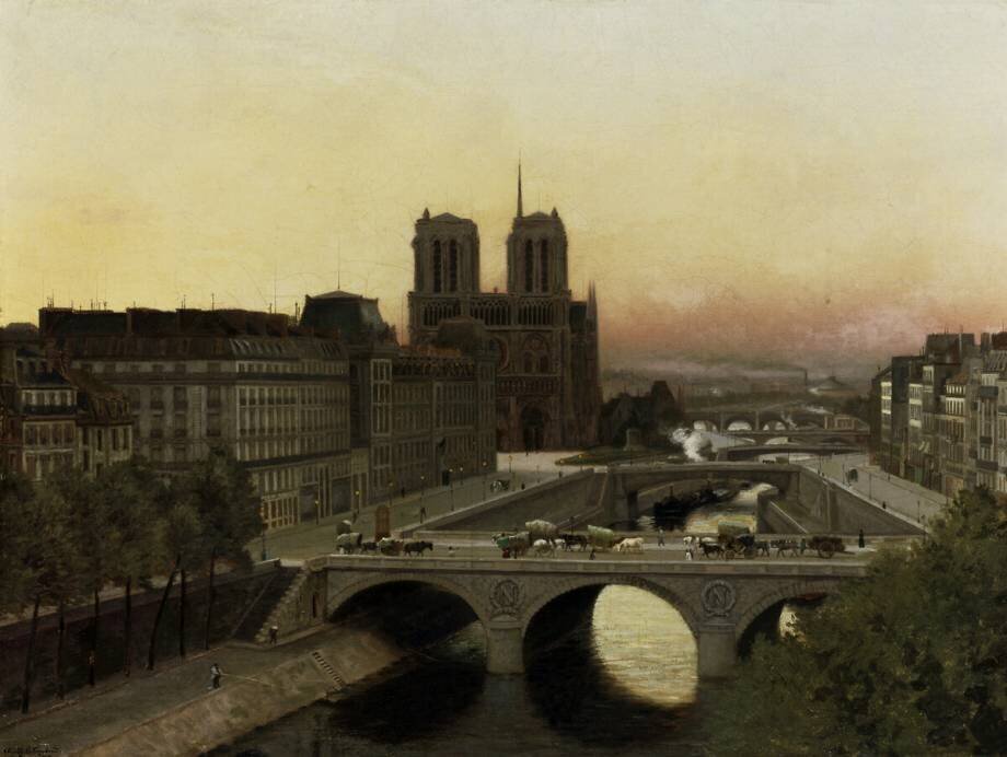 Keywords : 19th century, France, Paris, Seine, architecture, cart, cathedral, church, morning, Painting, picture, quay, religion, river, river, sight, sky, town, twilight