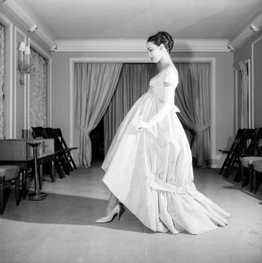 1671263 Presentation of New Haute Couture Modelling Lanvin Castillo Autumne Winter 1958 August 26 1958 Neg: D59842 (b/w photo); (add.info.: Presentation of the new Haute Couture models Lanvin Castillo Autumne Winter 1958 26 August 1958 Neg: D59842); Photo © AGIP; RESTRICTIONS MAY APPLY FOR COMMERCIAL USE - PLEASE CONTACT US; out of copyright.