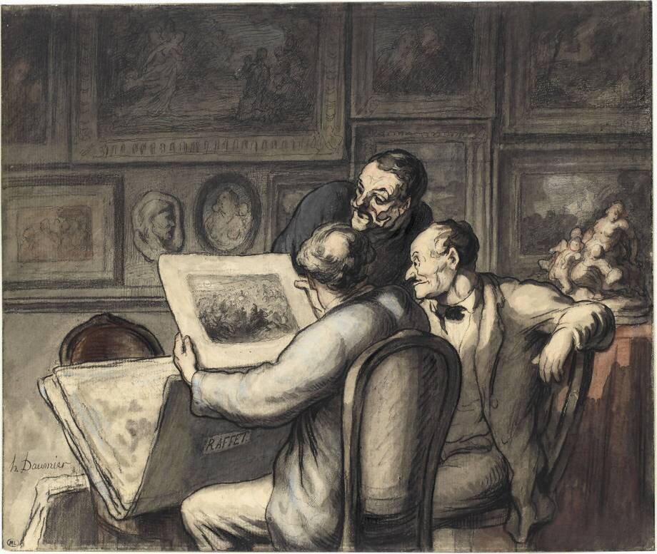 Les trois hommes regardent une oeuvre sortie d'un carton portant la mention "RAFFET". Il s'agit ici d'un hommage à Raffet : les amateurs s'extasient devant "La Revue Nocturne", oeuvre maîtresse du grand lithographe, publiée en 1837