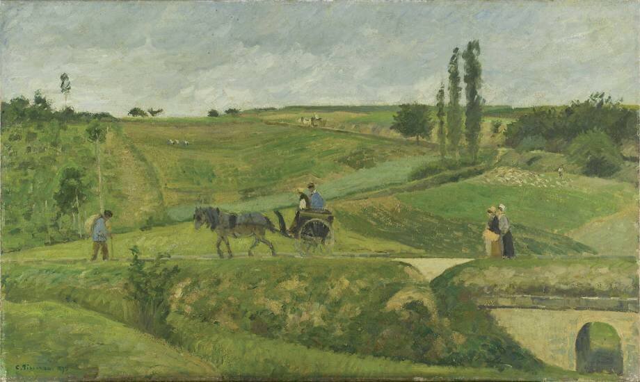 Keywords : 19th century, Impressionism, Val-d'Oise, bridge, bystander, cart, field, green, hill, landscape, man, path, route, tree, walking, woman