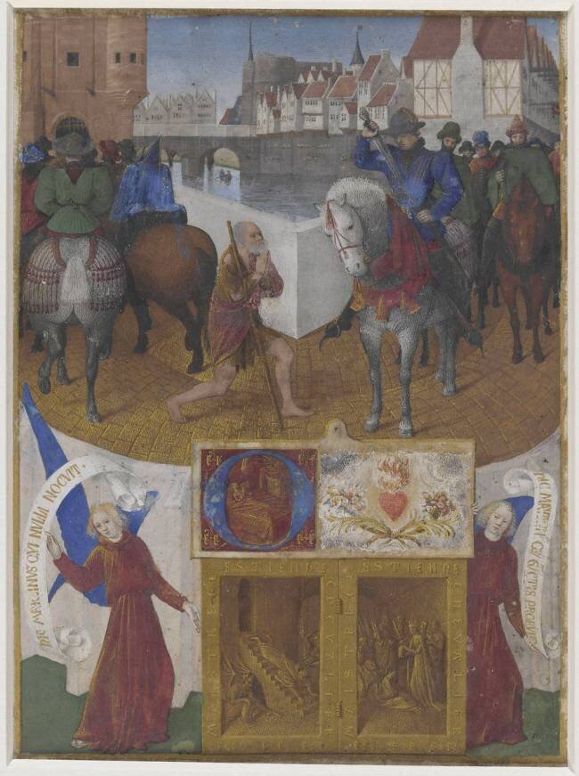 Subjects: ReligionKeywords: 15th century, Renaissance, angel, horse, illumination, knight, man, page (book), pond, poverty, street, text(Ref : 83448) © RMN /Thierry Le Mage