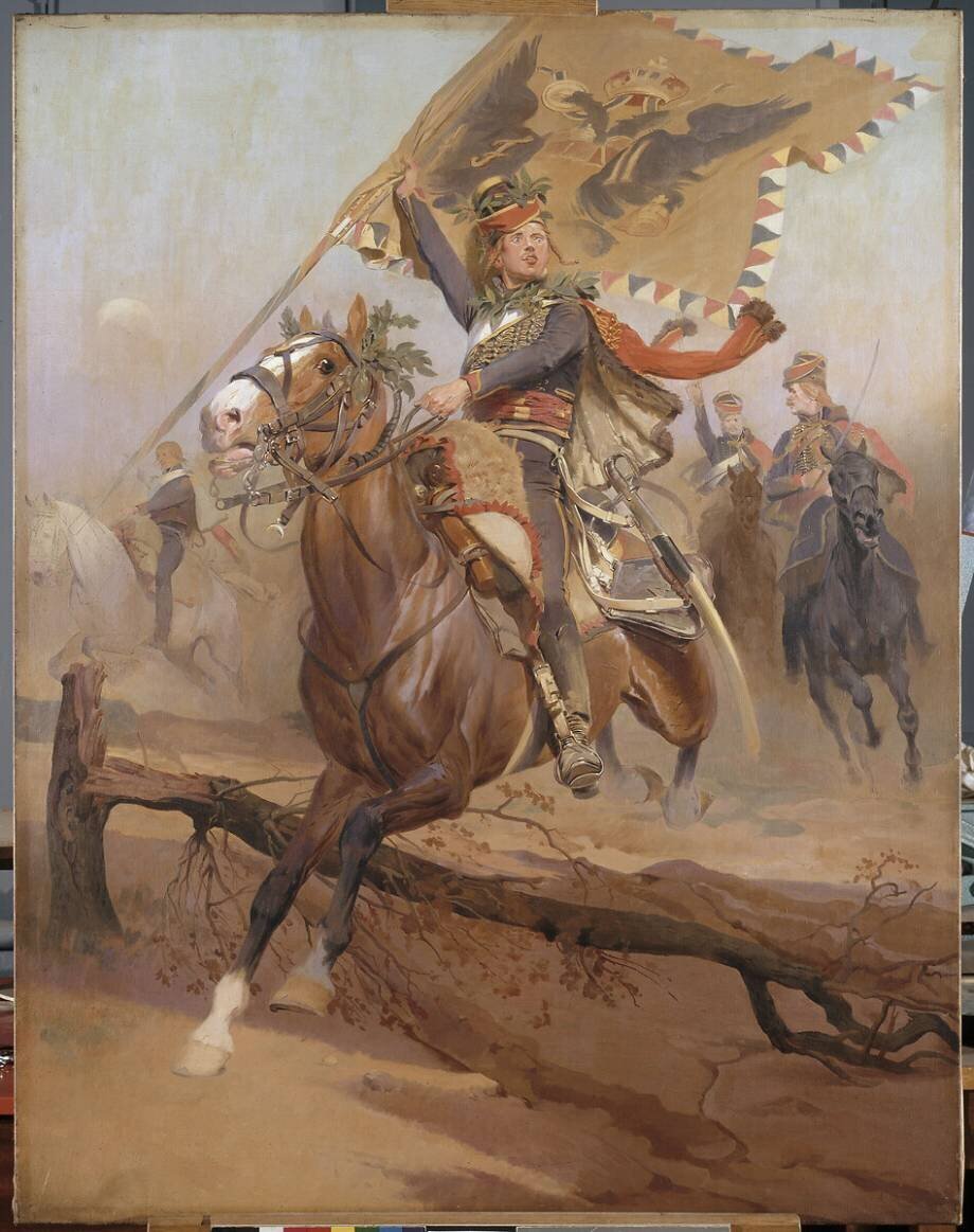 Charge du 2e régiment de hussards (lieutenant brandissant un emblème pris à l'ennemi), vers 1806-1809 ; oeuvre réalisée vers 1902