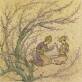Modèle de décor pour la céramique et la verrerie : dans le goût des miniatures persanes, jeune homme agenouillé offrant à sa compagne, elle aussi agenouillée, une branche fleurie, cueillie de l'arbre sous lequel ils sont abrités. 1863-1930. Fonds Emile Ga