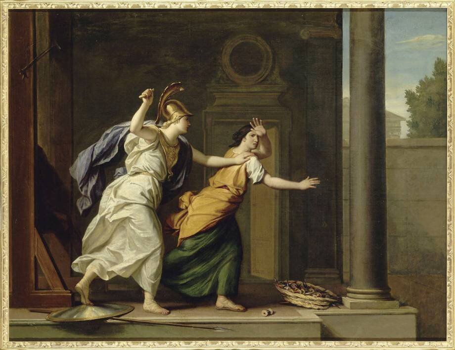 Minerve chasse la tisserante Arachné qui avait osé rivaliser en broderie avec elle, et la métamorphose en araignée qui avait osé rivaliser en broderie avec elle, et la métamorphose en araignée Vers 1688