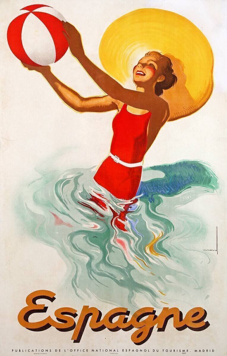 Subjects: TravelKeywords: 20th century, Mediterranean, Spain, advertising, ball, beach resort, journey, poster, seaside, straw hat, swimming costume, tourism, woman(Ref : 223576) © Antoine Pascal / akg-images