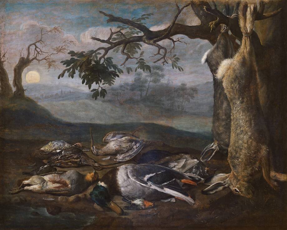 Keywords : 18th century, Europe, European, France, French, Sun, animal, bird, branch, colour, coloured, death, duck, landscape, livestock, pheasant, poultry, rabbit, stick, still life, sunset, tree, trunk, trunk, trunk