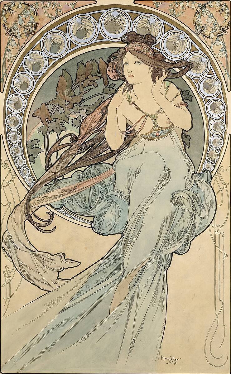 Subjects: Feminine Beauty, Flowers & Botany, Music, NudeKeywords: 19th century, Art Nouveau, Cancer, Libra, Painting, Virgo, animal, bird, blue, brunette, circle, clothing, colour, dress, hair, human, music, musician, pastel, pattern, people, person, sign of the zodiac, sitting, water colour, wind, woman, young woman(Ref : 141566) © Christie's Images / Bridgeman Images