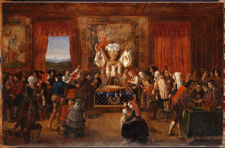 « Visite des habitants de la vallée d'Ossau au berceau d'Henri IV » is kept at Musée National du Château de Pau, Pau, France.