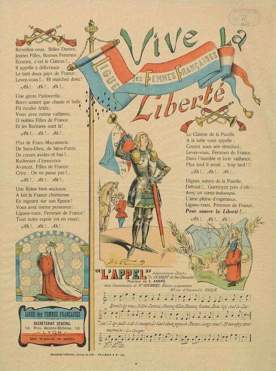 Ligue des femmes françaises, secrétariat général, 13 rue Sainte-Hélène, Lyon [1902] () Appartient à : [Recueil. Images d'Epinal de la Maison Pellerin]. Tome 16, [1902-1907] Notice du catalogue : http://catalogue.bnf.fr/ark:/12148/cb41410653r [musique] "L'appel", adaptation au chant "Le clairon" de Paul Déroulède, musique de E. André