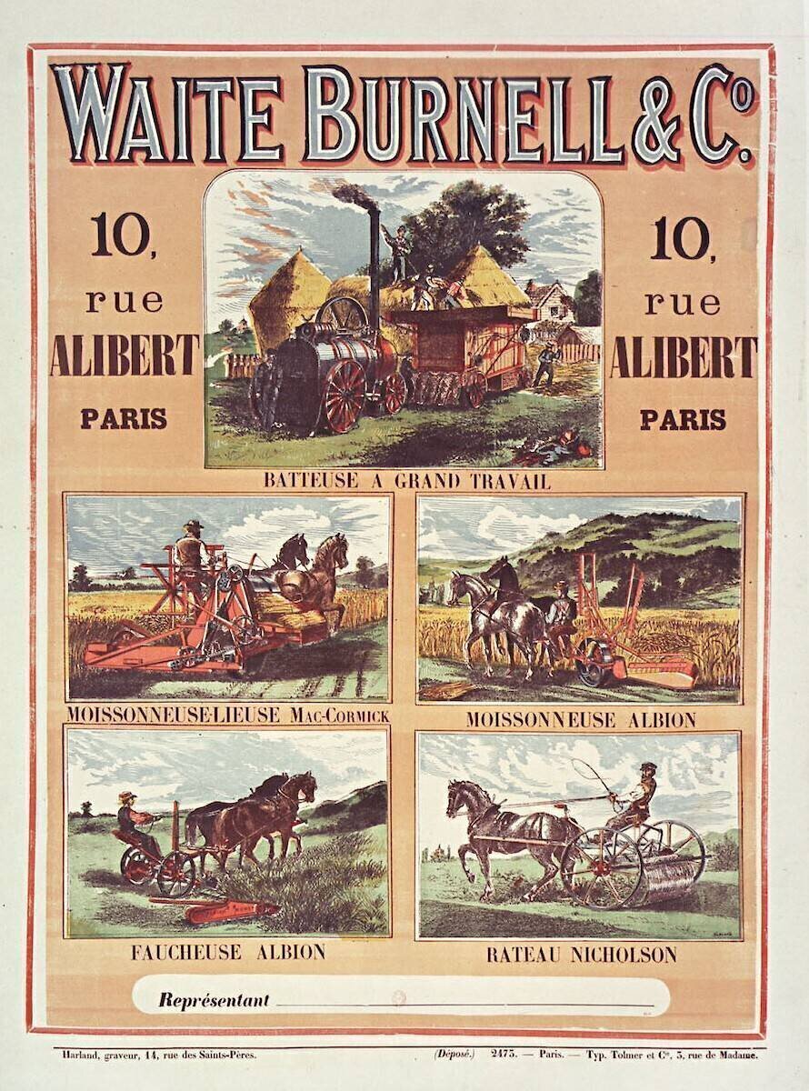 Waite Burnell & C°, 10 rue Alibert [...]. Batteuse à grand travail, moisonneuse Mac-Cormick, moisonneuse Albion [...].