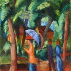 Despite his participation in the Blue Rider, Macke retained a certain independence and developed his own pictorial language, incorporating Expressionist influences from Cubism and Futurism, without however entering into total abstraction.
